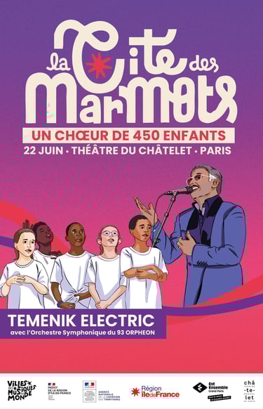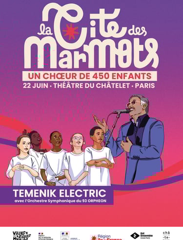 L'Orphéon s'est produit en juin dernier sur la scène du théâtre du Châtelet, dans le cadre d'un magnifique projet en lien avec l'association La Cité des Marmots et le groupe Temenik Electric. Le répertoire vibrant autour des chants de l'exil algérien a permis la fusion entre les musiques actuelles, la puissance d’un chœur de 450 enfants, et la richesse de la musique symphonique.