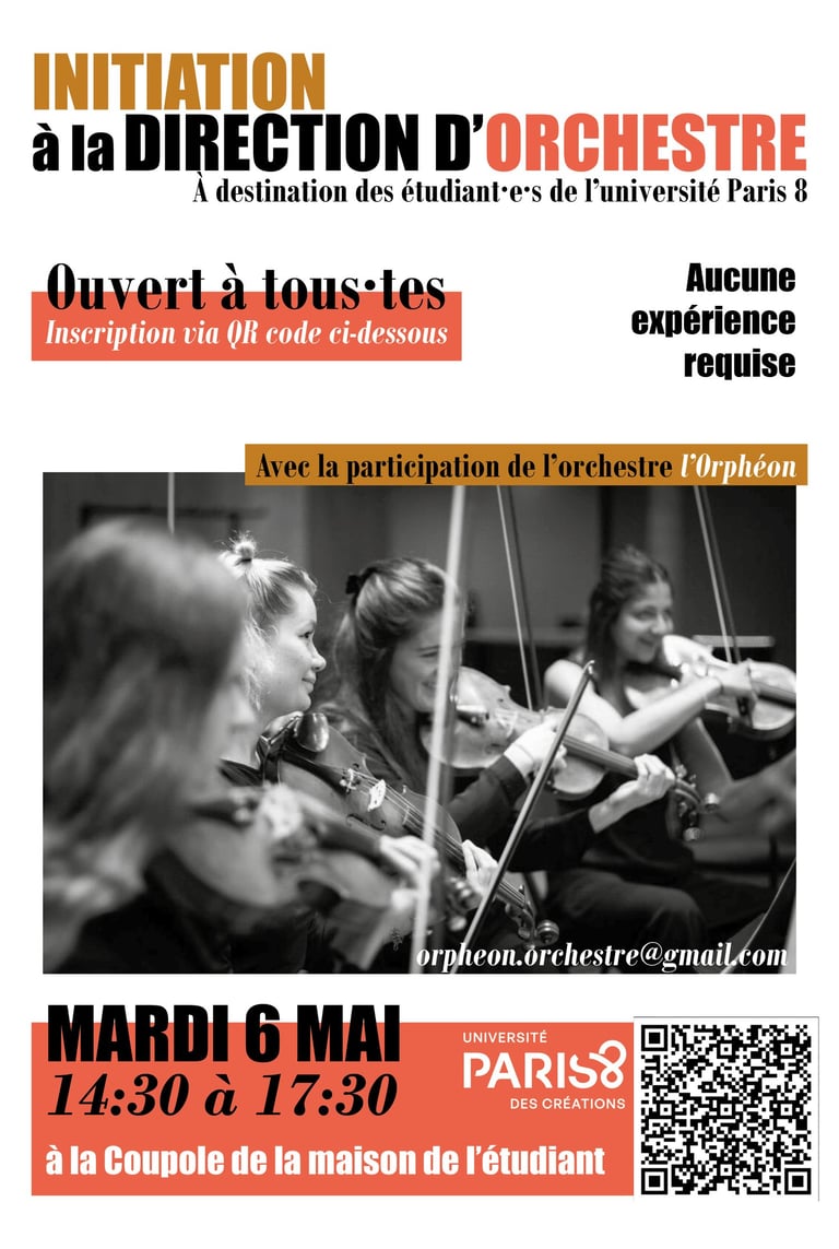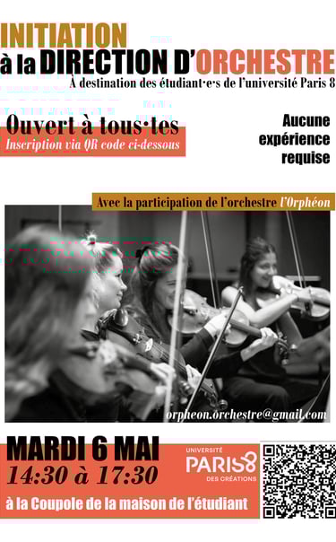 L'Orphéon a organisé une initiation à la direction d'orchestre à l'université Paris 8, le mardi 6 mai, de 14h30 à 17h30, à La Coupole – Maison des étudiants.