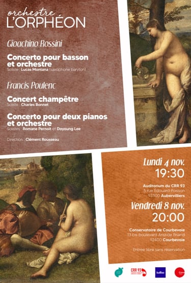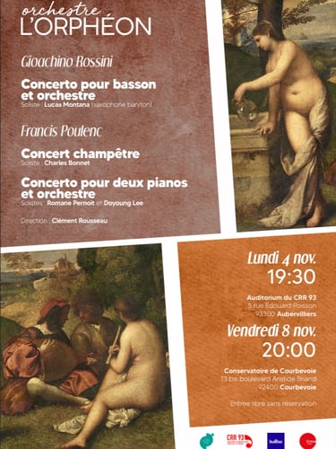 Le Concert Champêtre de Francis Poulenc est un pièce composée en 1928 et crée le 3 mai 1929 à la Salle Pleyel sous les doigts de la pianiste et claveciniste d’origine Polonaise Wanda Landowska et à la direction de Pierre Monteux. Cette œuvre fut commandée à Poulenc par cette dernière et reflète bien le caractère de la période d’entre deux guerre par sa vitalité mais en même temps par son caractère assez calme (deuxième mouvement). Cette œuvre a été interprétée au clavecin par Charles Bonnet actuellement étudiant au CNSMDP.